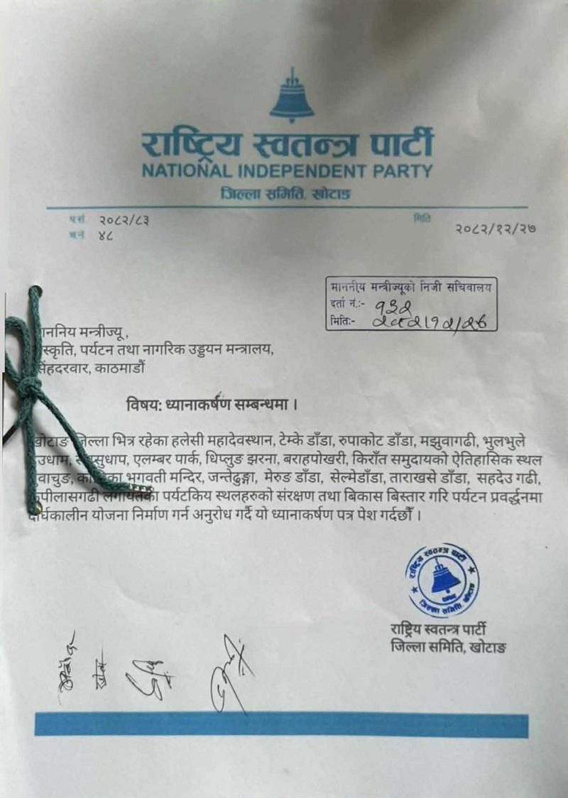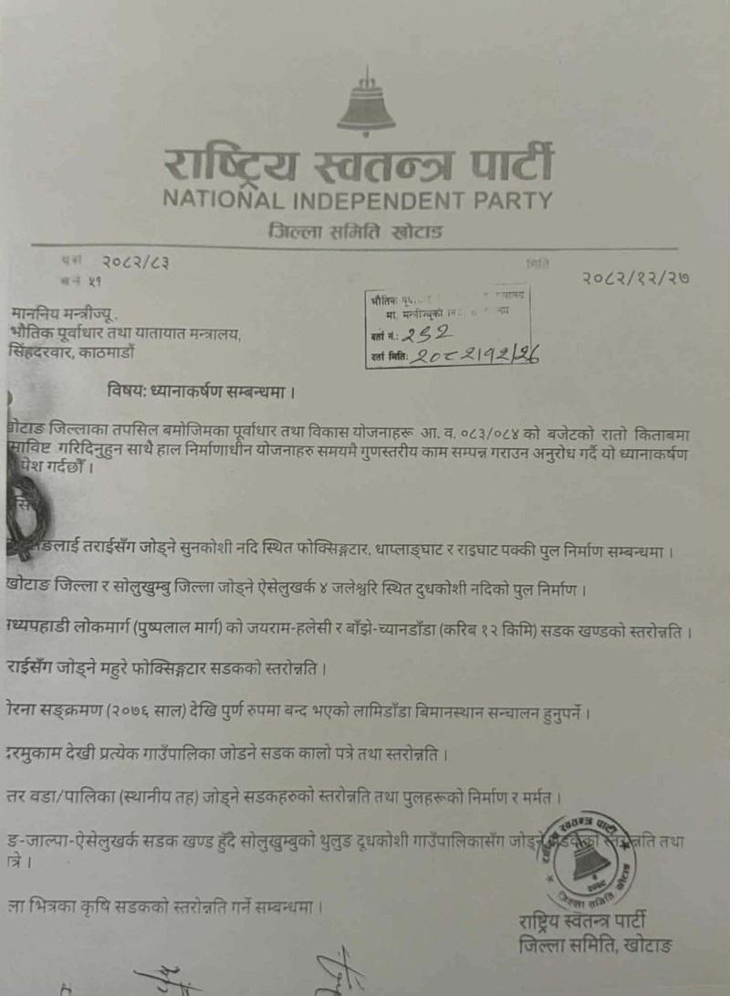पार्टीका खोटाङ जिल्ला समितिका उपसभापति गोविन्द भुजेल, सचिव तुला खत्री, सदस्य भगवती रोका लगायतको उपस्थितिमा उक्त ध्यानाकर्षण पत्र बुझाइएको खोटाङका जिल्ला सभापति मुकुन्द कृष्ण थापाले जानकारी दिनुभयो ।